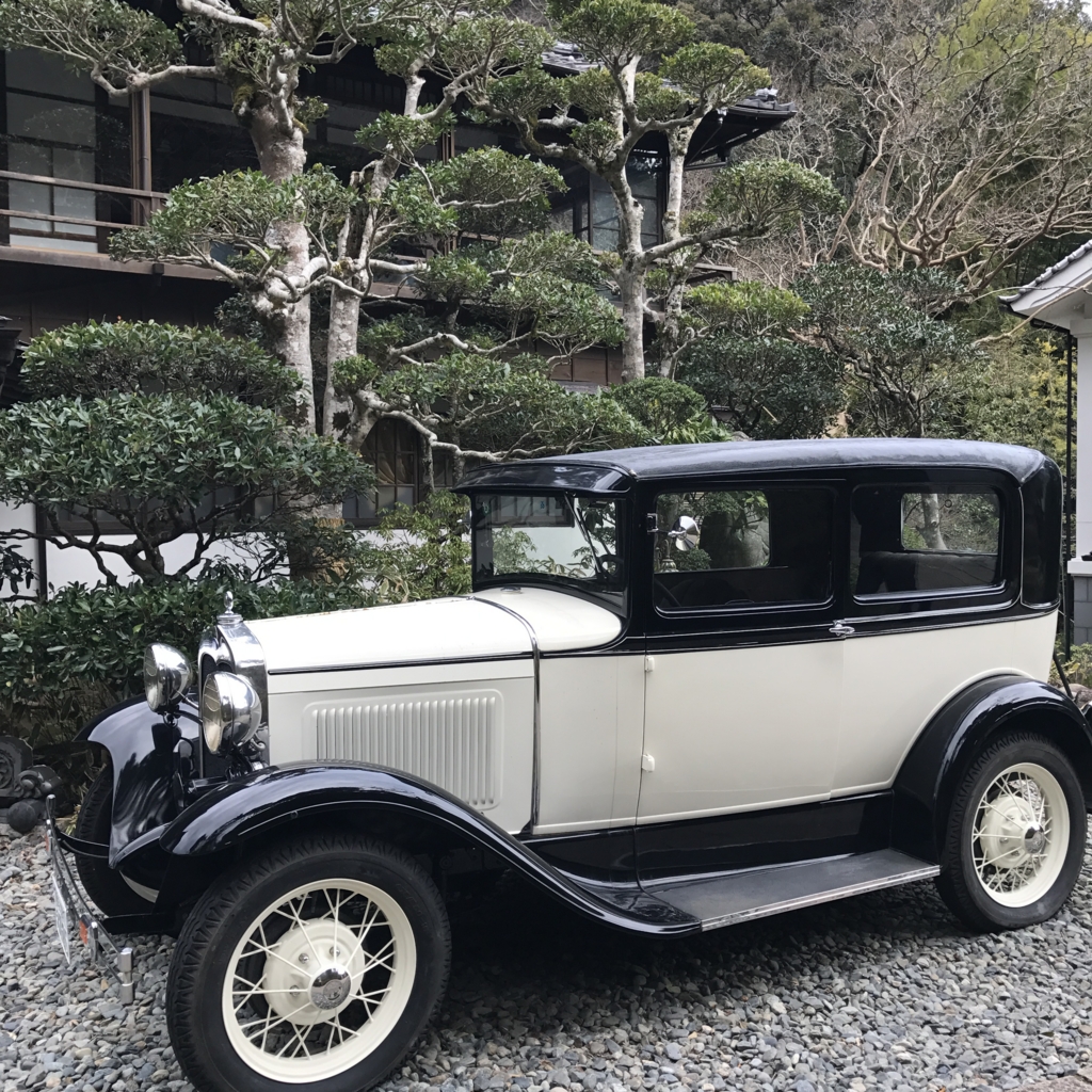 【写真】吉奈温泉「東府や」の離れの前に駐められたクラシックカー。昨日、足湯でパンを食べた帰りに撮った。
